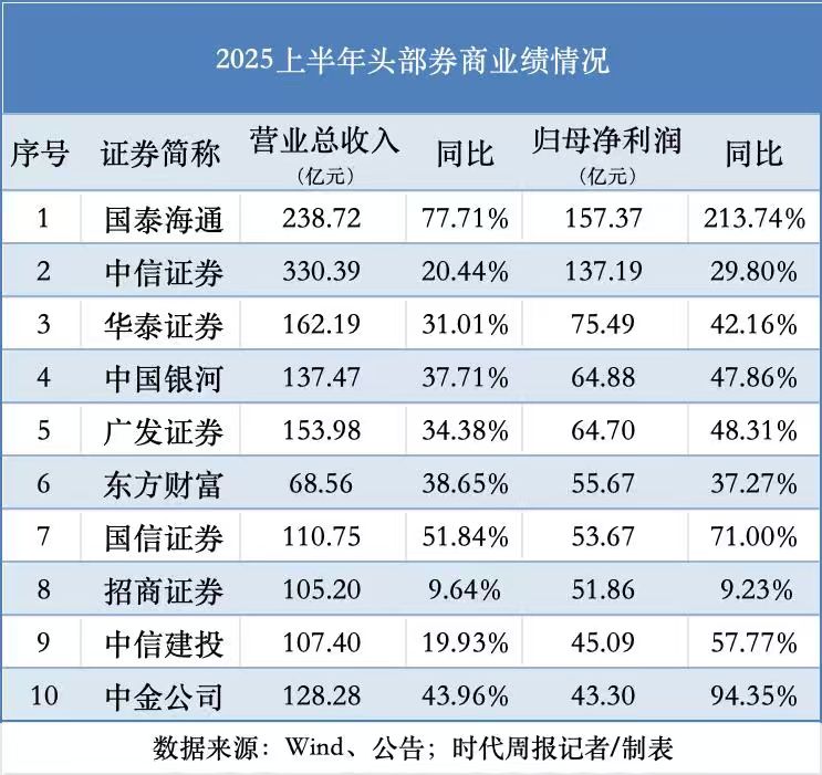 根据Wind数据,上半年10家头部券商营收合计1542.95亿元,同比增长14.89%;归母净利润合计749.23亿元,同比增长60.52%。具体来看,10家头部券商中,有7家归母净利润增速超过40%,其中有2家增速超过90%,分别是国泰海通(213.74%)、中金公司(94.35%)。